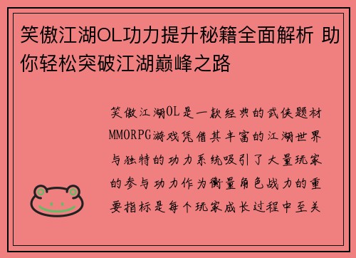 在《龙之谷》这款人气MMORPG中,元素职业以其高爆发和强大输出能力受到广大玩家的喜爱。如何通过合理的加点和技能搭配,全面提升战力,成为每位元素职业玩家都需要研究的问题。本文将从四个方面进行详细解析:元素加点的基础原则、技能搭配的核心思路、战力提升的关键技巧以及如何根据实际需求进行加点调整,帮助玩家...